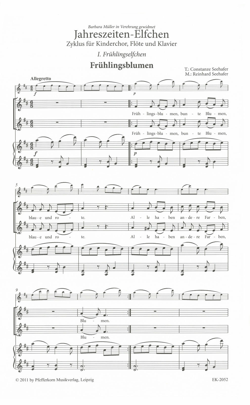 Zyklus nach 11 Elfchen und 1 Zwölfchen [KiCh,Fl,Klav] Dauer: 20' Text: Joseph von Eichendorff, Friedrich Hebbel, Eduard Mörike, Carmen Seehafer, Constanze Seehafer, E. F. Seehafer, Reinhard Seehafer und Robert-Leonard Seehafer