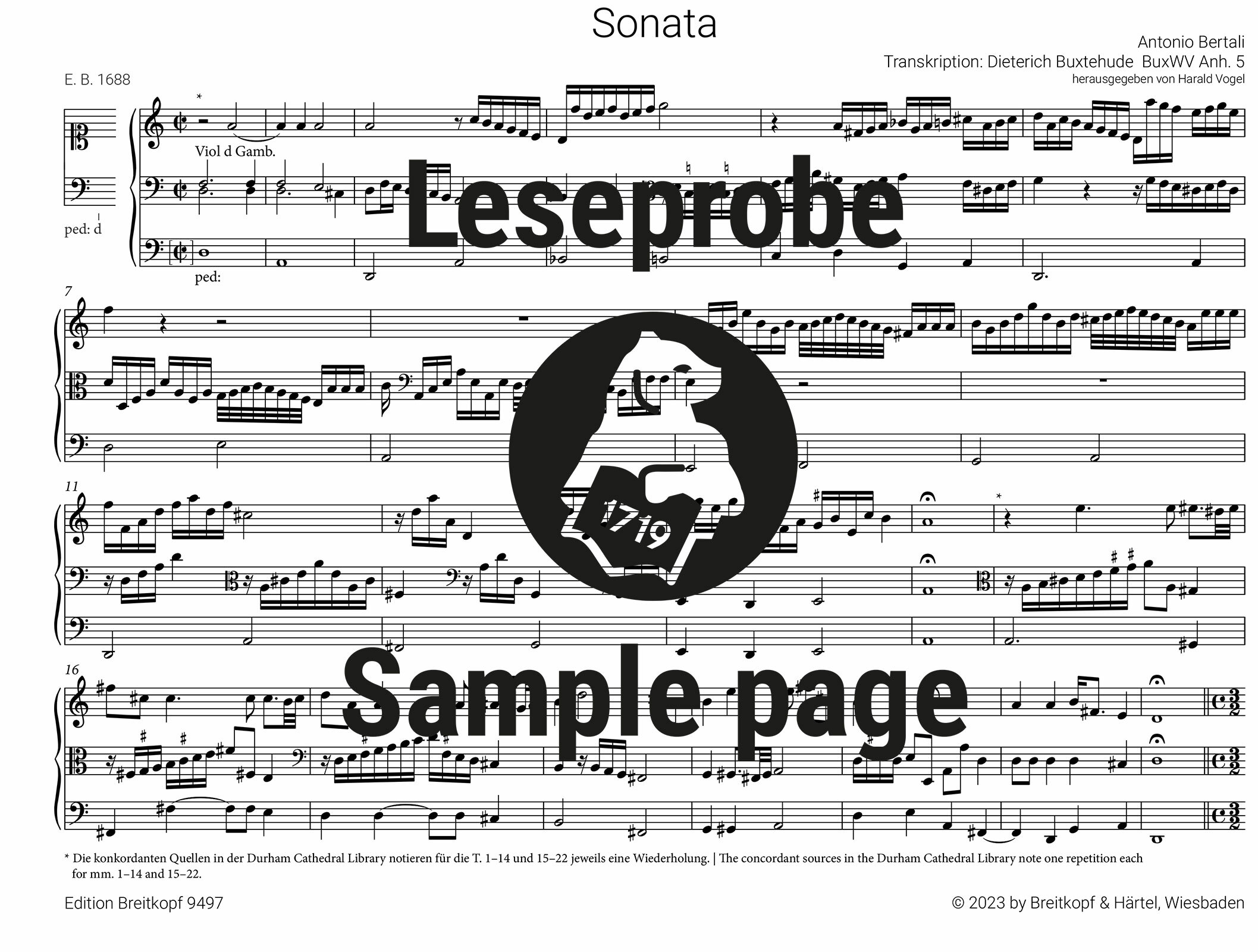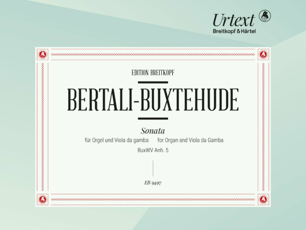 handelt es sich um die Transkription einer dreisätzigen Triosonate für Violine, Viola da gamba und Basso continuo des Hofkapellmeisters am Habsburger Hof, Antonio Bertali. Buxtehude richtete sie für Orgel und Viola da gamba ein. Sie ist zur Aufführung im Konzert und im Gottesdienst während des Abendmahls gleichermaßen geeignet und bietet damit eine willkommene Erweiterung des Gambenrepertoires.