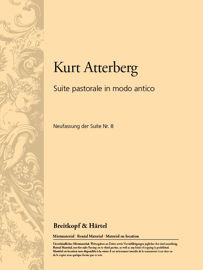 Die achte von insgesamt neun Suiten Kurt Atterbergs entstand 1931 und trägt den vollständigen Titel Suite pastorale in modo antico. Der Komponist nimmt damit auf die Musik „im alt-italienischen Stil“, zum Beispiel von Arcangelo Corelli, Bezug. Im Gegensatz zu vielen seiner anderen Suiten, die Stücke aus seinen Bühnenmusiken zusammenfassen, hat Atterberg seine achte Suite im Sinne der Wortherkunft als Folge barocker Tänze angelegt. Er spielt dabei auf verschiedene Tanztypen an. Das Werk schließt zum Beispiel mit einer lebhaften Gavotte im geraden Takt. Ebenso findet sich eine Aria mit einem gesanglichen Thema in den Geigen, grundiert mit einer sparsamen Begleitung. Die Klangsprache ist zwar an die von älteren Zeiten angelehnt, Atterberg scheint aber trotzdem als Komponist durch, zum Beispiel mit einem höheren Grad an Dissonanz als beim Vorbild.