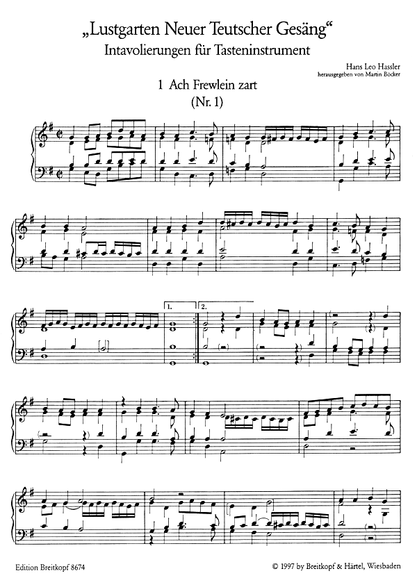 Hasslers Liedsammlung „Lustgarten Neuer Teutscher Gesäng“ (1601) war so beliebt, dass sie um 1640 vollständig für Tasteninstrumente eingerichtet wurde. Martin Böcker hat für den Erstdruck 25 wirkungsvolle Stücke aus dieser Bearbeitung ausgewählt, um möglichst viele Liebhaber älterer Tasteninstrumente in den „Lustgarten“ zu entführen.