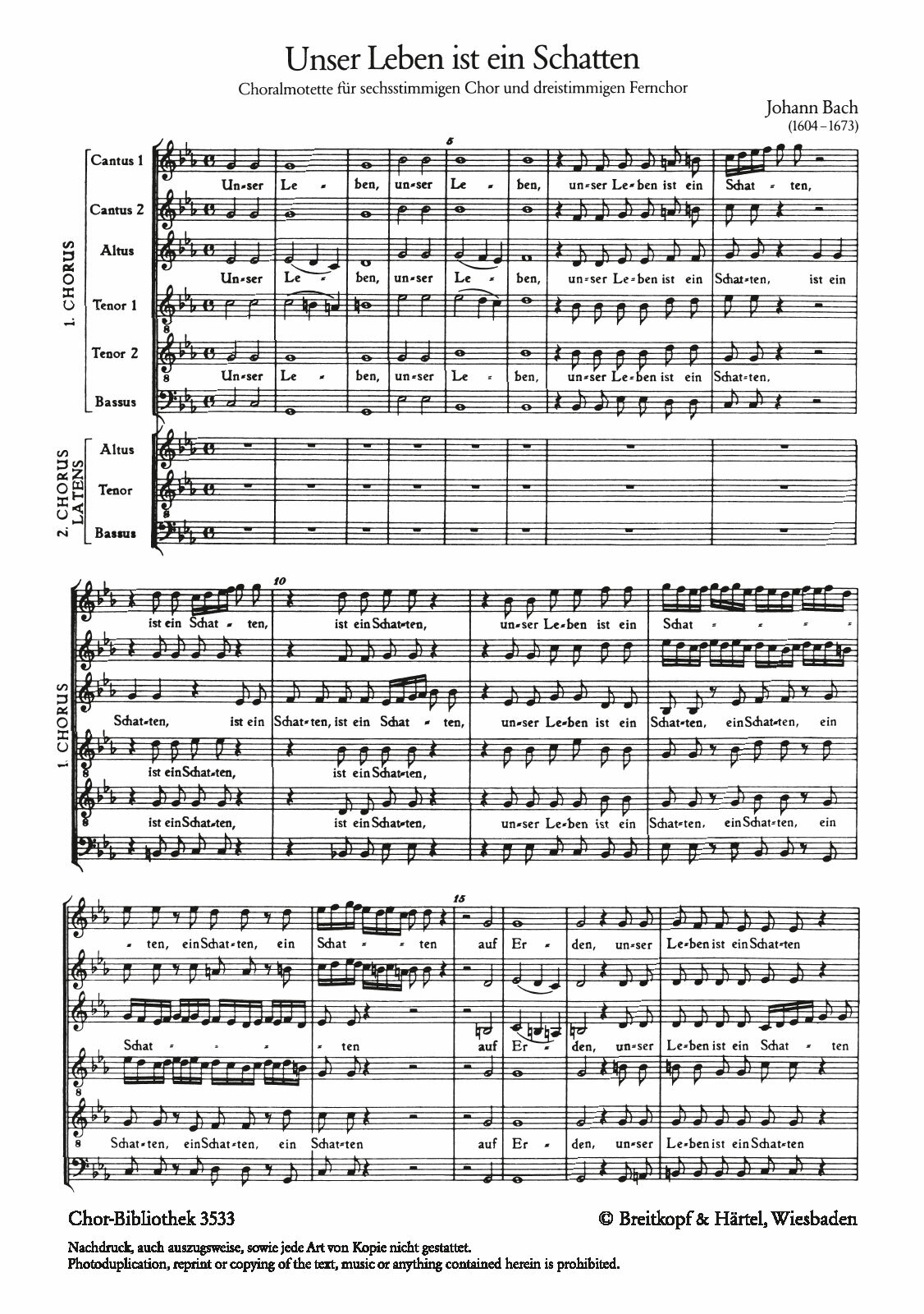Johann Bachs Motette Unser Leben ist ein Schatten erschien bereits 1821 im Druck, wurde damals aber noch fälschlich Johann Michael Bach zugeschrieben. Außergewöhnlich ist die Besetzung mit einem sechsstimmigen Hauptchor und einem dreistimmigen Fernchor („Chorus latens“), der dem Stück Raumklang und damit eine ganz besondere Atmosphäre verleiht.