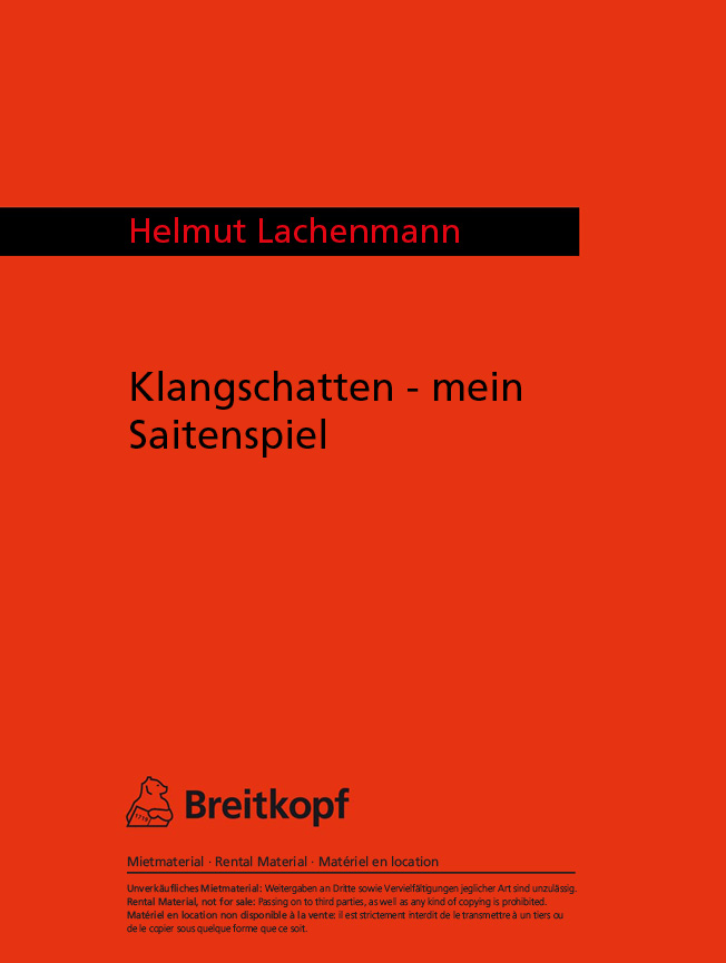 In combination with “Gran Torso” and minor pieces of chamber music, “Klangschatten – mein Saitenspiel” for 48 strings and 3 grand pianos belongs to a series of works whose sounds are oriented towards in the dialectics of „denial“ and „offer“: By excluding familiar sound practice, all that was suppressed hitherto is revealed. In a sense, the soundscape discloses the verso of conventional philharmonic patterns; the strings, instead of resounding, are uniquely prevented from sounding. Naturally, it may not be a matter of structurally proceeding with the unveiled sound residues as if nothing had occurred. Surely the conjured aura is to be undone, but not forgotten or ignored. This explains the succinct formulation of the musical text – a type of transparent façade – compelling the ear to listen behind the sounds, to perceive the aura as stifled, but also to grasp the process of denial as the tender of expressive intensity that reflects the bourgeois longing for beauty and wishes to fulfill, that is, to overcome it. This composition is dedicated to Michael Gielen.