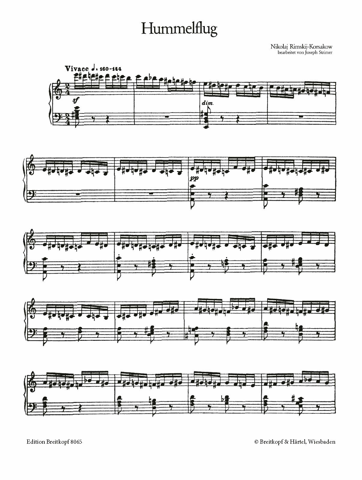 Kaum jemand weiß, dass dieses Bravourstück aus der Oper Das Märchen vom Zaren Saltan von Nikolaj Rimskij-Korsakow stammt. Recht bald nach seiner Entstehung erschien der Hummelflug in zahlreichen Bearbeitungen. Bearbeitungen für Orchester finden Sie hier.