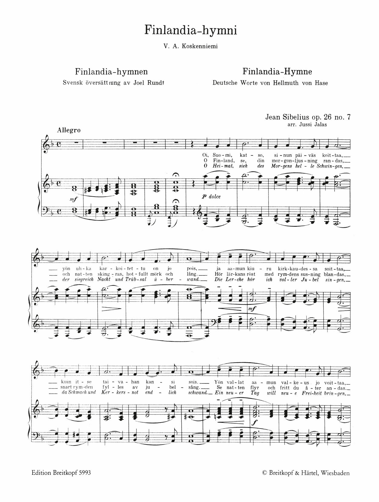 Oi Suomi, katso, sinun päiväs koittaa / O Finland, se, din morgonljusning randas – Hymne über ein Thema aus Finlandia op. 26 [mSt,Klav] Dauer: 2'