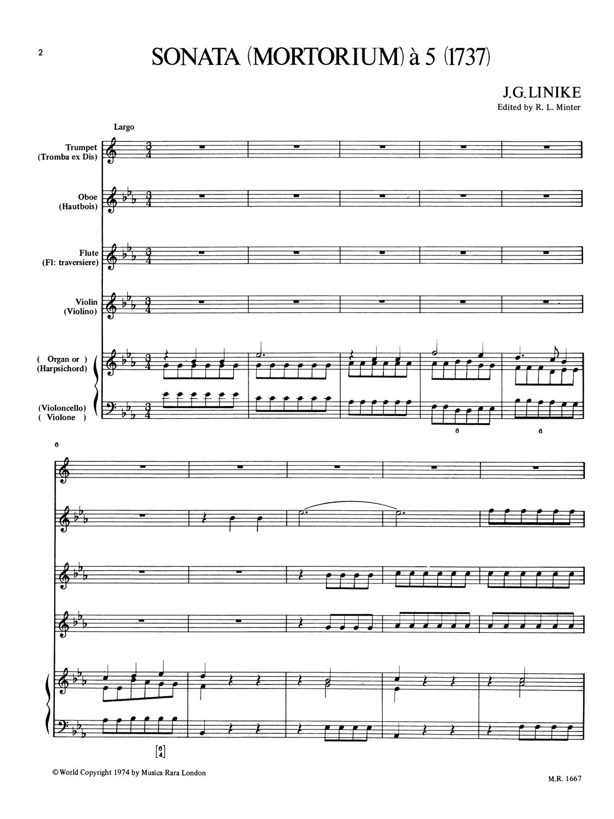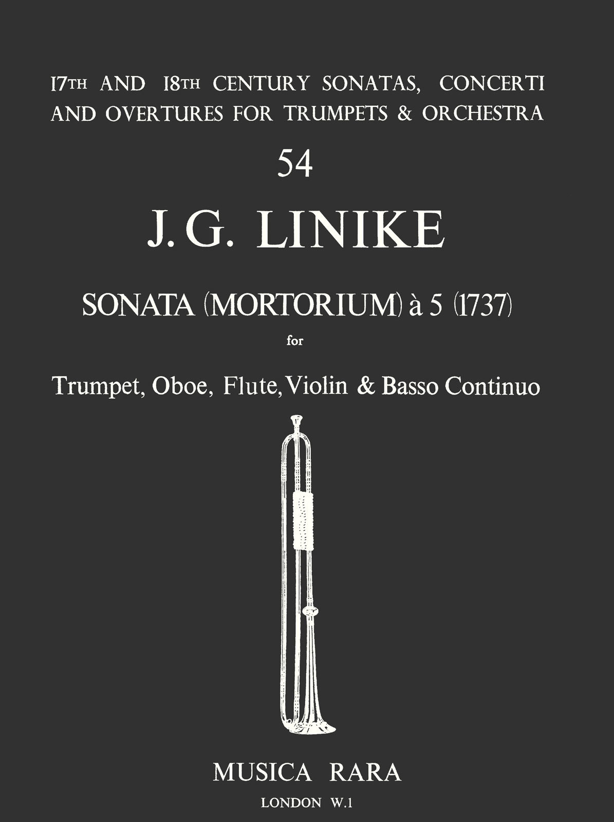 Johann Georg Linikes Mortorium à 5 ist in Manuskriptform in der Mecklenburgischen Landesbibliothek in Schwerin zu finden. Der ungewöhnliche Titel scheint darauf hinzudeuten, dass das Werk für eine Trauerfeier geschrieben wurde, da alle Instrumente „con sordini“ spielen müssen. Eine genauere Untersuchung der Musik selbst zeigt aber, dass das Werk nichts anderes als eine weltliche Sonate darstellt. Der Stil ähnelt in vielerlei Hinsicht Telemann, obwohl die Instrumentenkombination, zu der auch eine Es-Trompete gehört, äußerst selten ist, und man sich an das Brandenburgische Konzert von Bach erinnert fühlt, das für dieselbe Gruppe von Solisten geschrieben wurde. Dieses Werk, das vom Herausgeber mit dem aussagekräftigeren Titel Sonate versehen wurde, wird hier zum ersten Mal veröffentlicht und ist Linikes einzige bekannte Komposition für Trompete.
