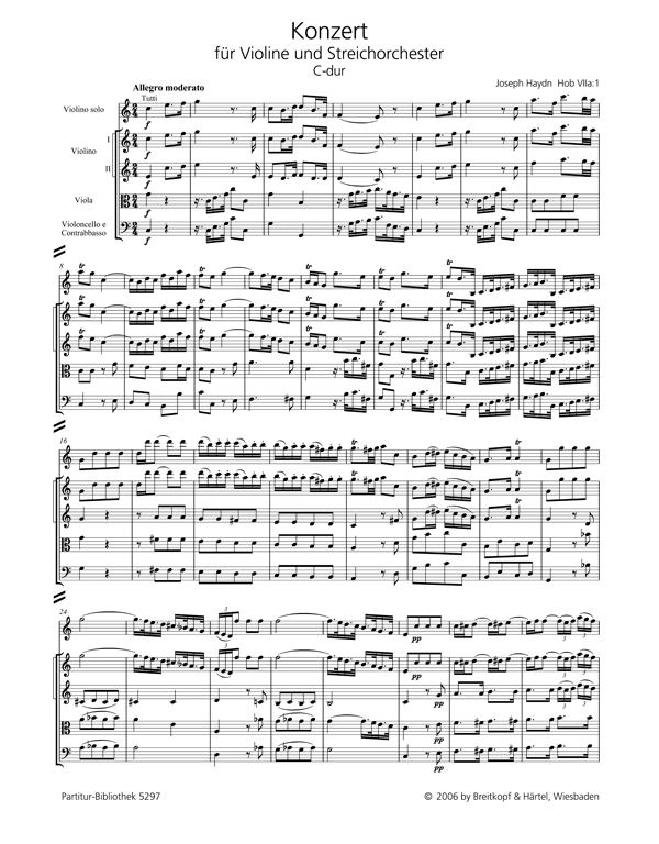 Doch zurück zur Überlieferung: eine frühe Abschrift dürfte spätestens 1769 in den Besitz des Verlags Breitkopf & Härtel übergegangen sein, der 1836 von verschiedenen Violinkonzerten Haydns Kopien anbot und schließlich im Jahr 1909 auch die Erstausgabe besorgte. Mit der Zerstörung großer Teile des Verlagsarchivs am Ende des zweiten Weltkriegs verlieren sich dann bedauerlicherweise die Spuren dieser Hauptquelle. Schon die Partitur in der Haydn-Gesamtausgabe (Serie III/1) geht 1969 notgedrungen auf den Notentext aus verschiedenen Abschriften zurück. Neben der erwähnten Quelle in Seitenstetten sind eine Stimmenabschrift in Genua sowie weitere, wohl noch zu Haydns Lebzeiten entstandene Kopien in Ceský Krumlov (Böhmisch Krumau), Melk, Graz und Schlägl/Oberösterreich überliefert. Wahrscheinlich basiert der Breitkopf-Erstdruck direkt auf der schon 1769 im Besitz des Verlags befindlichen Abschrift, die wie das Autograph verloren gegangen ist. Zusammen mit der Abschrift aus Genua bot dieser Druck, in dem laut den Mitteilungen des Verlags im Januar 1909 „offensichtliche Fehler“ der „etwas mangelhaften“ Archivkopie verbessert sind, der Gesamtausgabe einen ausreichend zuverlässigen Notentext, um als Hauptquelle für das C-dur-Konzert gelten zu können.