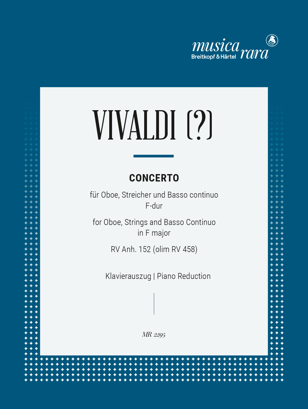 Die Zahl der Oboenkonzerte Antonio Vivaldis lässt sich nicht genau bestimmen. Obwohl das vorliegende F-dur-Konzert früher als sicheres Werk von Vivaldi angesehen wurde (daher die alte RV-Nummer 458), haben sich die Zweifel an der Autorschaft Vivaldis verstärkt (anders als beim C-dur-Konzert RV 446 MR 2294) . Diese lassen sich auch durch die Existenz zweier Quellen aus der umfangreichen Sammlung in Lund (Schweden) nicht auflösen. Besonderes Augenmerk verdient der Adagio-Mittelsatz, der in den beiden Quellen unterschiedlich überliefert ist. In der Erstausgabe für Oboe und Klavier wird zunächst die unverzierte Fassung abgedruckt, anschließend bietet Herausgeber Sandro Caldini das Adagio dann in der aufführungspraktisch interessanten Version mit den zeittypischen Verzierungen.