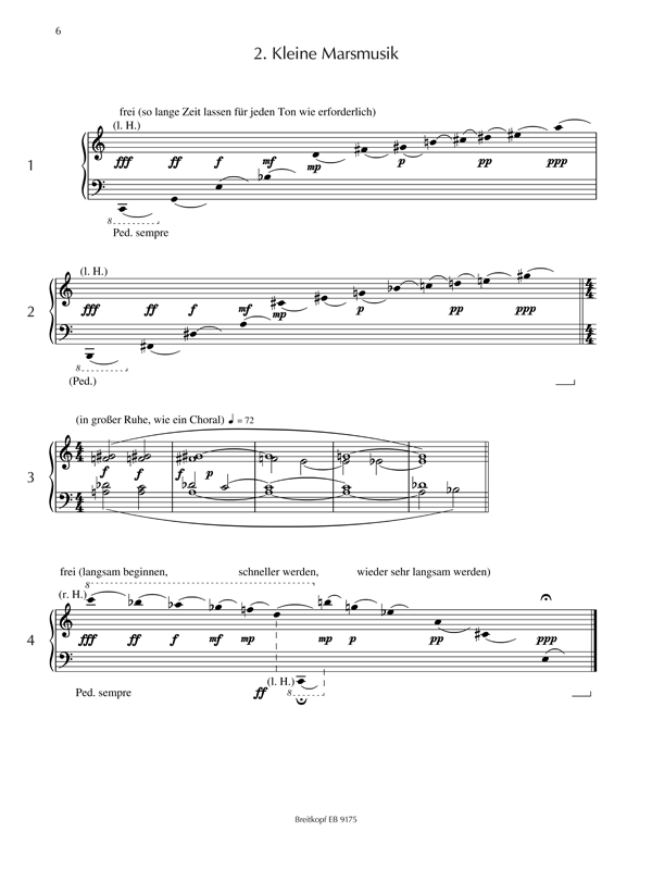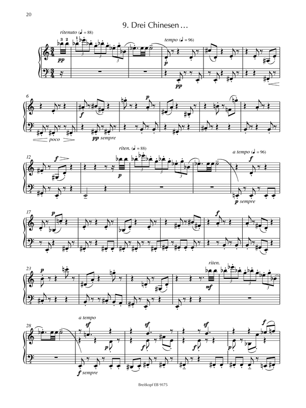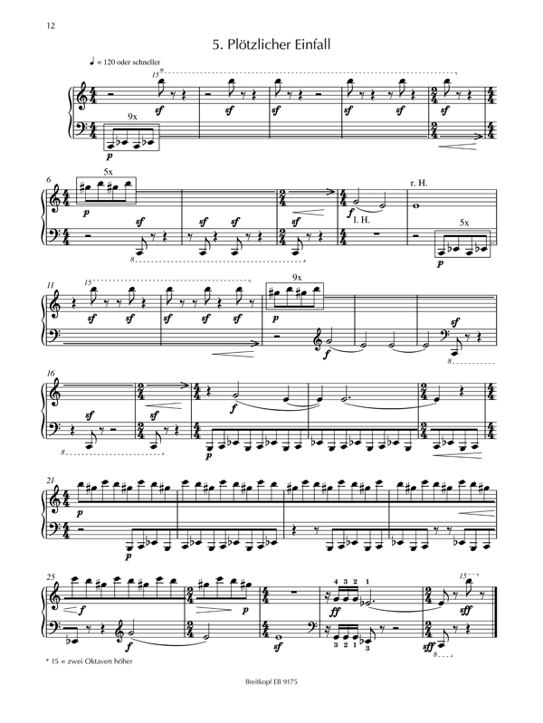 In den elf kurzen Klavierstücken stellt sich der Komponist in die Nachfolge von Olivier Messiaen, Karlheinz Stockhausen, Helmut Lachenmann und Nicolaus A. Huber. Die Miniaturen sind ungefähr nach Schwierigkeitsgrad geordnet. Für den Unterricht und – einzeln oder komplett – für das Vorspiel eignen sich die Stücke gleichermaßen. Wer sie hörend erarbeiten möchte, findet eine Einspielung auf der beigefügten CD. Das Heft enthält außerdem zu jedem Stück Hinweise auf außermusikalische Zusammenhänge sowie Aufgaben für die Schüler, Hintergrundinformationen – und schließlich auch Texte, die bei der Aufführung rezitiert werden können. Hier erfahren wir dann mehr über den „Beleidigten Papagei“, der auf die Modi Messiaens zurückgeht und dem Heft den Namen gab. Die „Drei Chinesen …“ hingegen sind keine Verwandten von Lachenmanns „falschem, ein wenig besoffenen“ Chinesen aus „Ein Kinderspiel“ (EB 8275). Sie entspringen vielmehr dem bekannten Scherzlied und geraten mit ihrem Kontrabass unweigerlich wieder in die Polizeikontrolle …