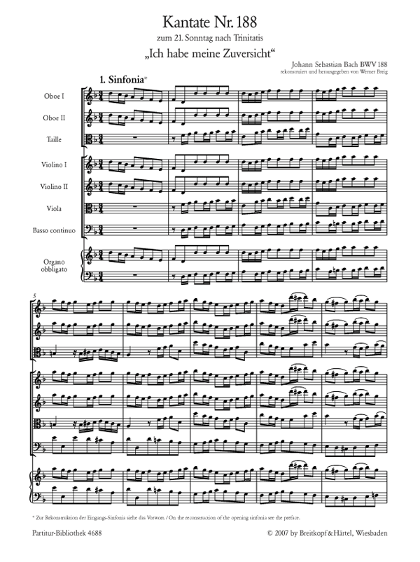 Mit dieser Neuausgabe wird das Projekt Bach-Kantaten komplett käuflich lieferbar mit einem editorisch besonders anspruchsvollen Werk fortgesetzt. Der renommierte Bach-Forscher Werner Breig hatte bei Breitkopf zuvor schon die bekannte h-moll-Suite (PB/OB 5397, EB 8737) und die ihr zugrunde liegenden, rekonstruierte a-moll-Suite für Violine, Streicher und Basso continuo (PB/OB 5398) neu herausgegeben. Der äußerst rudimentär überlieferten Sinfonia gilt dabei sein besonderes Interesse. Schritt für Schritt setzt Breig aus der abschließenden virtuosen Orgelpassage und dem Dacapo-Hinweis mit dazugehörigem Noten-Incipit den gesamten Einleitungssatz wieder zusammen. Pate für die mit immenser Stilkenntnis durchgeführte Rekonstruktion steht ein frühes, in dieser Form verschollenes d-moll-Violinkonzert, das Bach selbst später zum Cembalokonzert BWV 1052 umarbeitete. Die Musikpraxis darf sich mit dieser Neuausgabe über eine erstmals vollständig wieder gewonnene Bach-Kantate freuen.