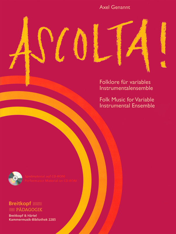 Ascolta! (= Hör zu!) heißt das Ensemble des Herausgebers, mit dem er alle Stücke geprobt hat: im Unterricht, im häuslichen Kreis, auf der Straße und sogar bei internationalen Festivals. Zuhören ist im Zusammenspiel unabdingbare Voraussetzung, vor allem weil die stilgerechte Aufführung von Folkmusik auch improvisatorische Fähigkeiten fordert. Das Spielmaterial besteht aus Partituren, die ohne Umblättern realisiert werden können. Sie sind auf der beigefügten CD-ROM für Instrumente in C, in B und auch in einer Gitarrenversion enthalten. Der Untertitel „variables Ensemble” ist wörtlich zu nehmen, denn der Fantasie bei der Instrumentierung und dem Ablauf der Stücke sind kaum Grenzen gesetzt: zu den klassischen Melodieinstrumenten kommen Akkordeon, Gitarre und Perkussion hinzu. Die 14 Stücke stammen aus Europa, aus dem Jiddish Folk, aber auch aus Südamerika. Abgerundet wird die Ausgabe durch Hinweise zum Ensemblespiel, zu den einzelnen Stücken, zur Spielweise auf Perkussionsinstrumenten sowie durch freie Übertragungen der Liedtexte.
