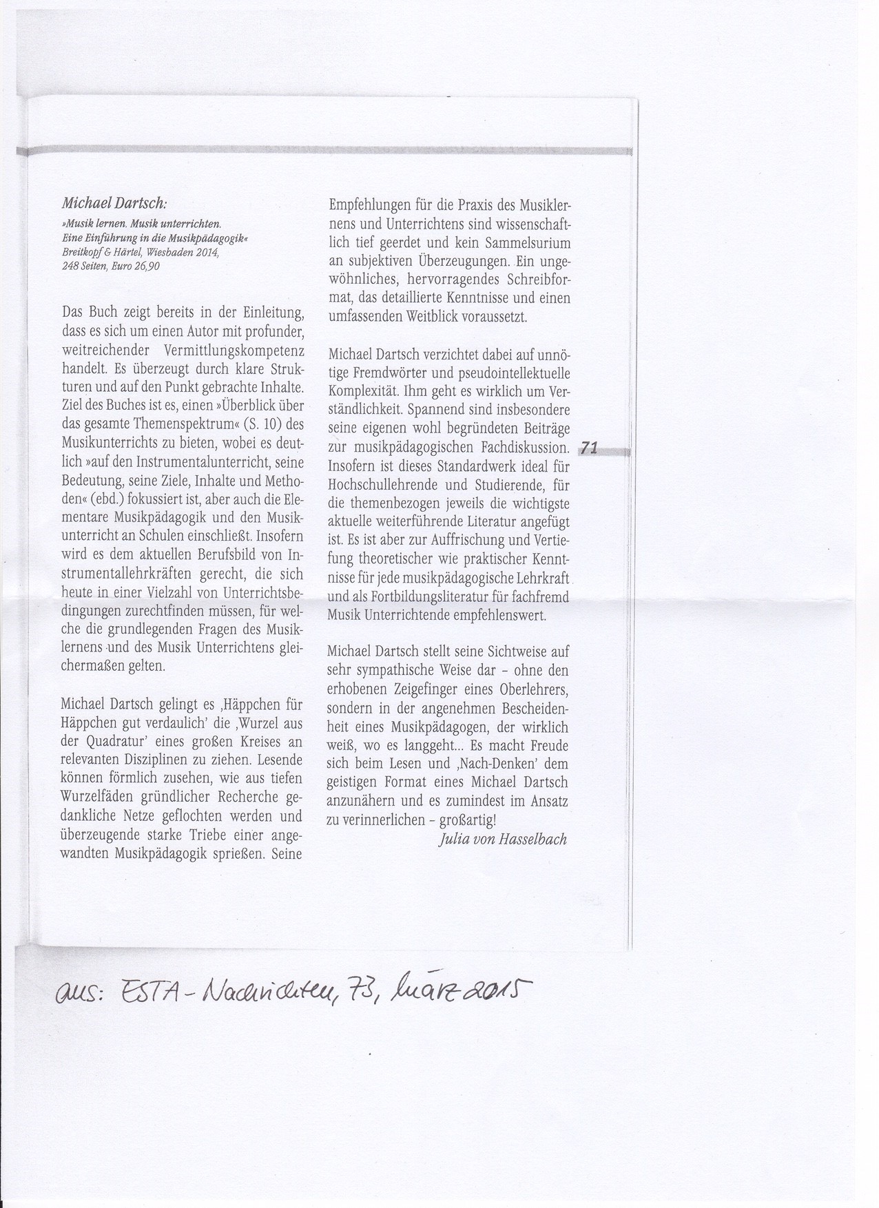 „Dartsch geht es um Verständlichkeit. Spannend sind insbesondere seine eigenen, wohl begründeten Beiträge zur musikpädagogischen Fachdiskussion. Insofern ist dieses Standardwerk ideal für Hochschullehrende und Studierende. Es macht Freude, sich beim Lesen und ,Nach-Denken' dem Format eines Michael Dartsch anzunähern, und es zumindest im Ansatz zu verinnerlichen – großartig! (Julia von Hasselbach, ESTA-Nachrichten, 1/2015)